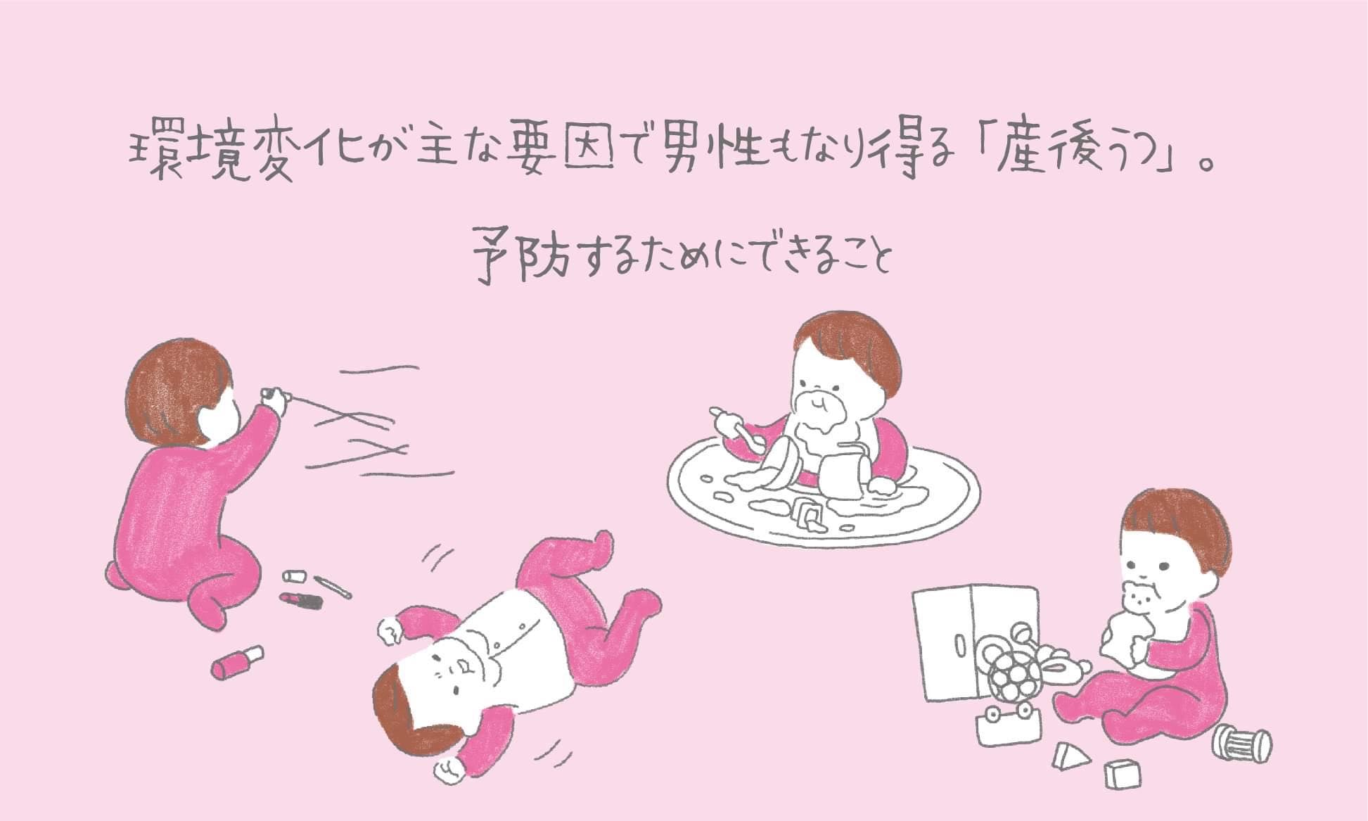 ー第一子を出産したとき、目の前にいるふにゃふにゃの赤子のいのちを守らなければ!と使命感に駆られながらも、これでいいのか不安で、夜泣きと授乳で十分に眠れない日が続き、身体的にも精神的にも追い詰められて、涙が出てきたことがありました。 産後は誰しも環境が変化するし、初めての子育てにプレッシャーや不安を感じますよね。よく産後うつは女性ホルモンが関係していると言われますが、育児をしている男性も産後うつになることがわかっているんです。 厚労省の国民生活基礎調査(2016年)をベースに、産後1歳未満の子どもがいるふたり親家庭3514世帯を解析したところ、お父さんの11.0%に精神的な不調のリスクがあるとされ、お母さん(10.8%)とほぼ同水準であることが判明しました(国立成育医療研究センター研究所 政策科学研究政策開発研究室室長、竹原健二氏らの研究より)。つまり、女性ホルモンの分泌量の変化に関係なく、男性も女性も、産後は大きな環境変化が要因で、うつ病になるリスクが高まるんです。 ーへえ、男性も産後うつになるとは!これからもっと男性の育休取得が進んでいったら、より男性の産後うつも増えていきそうですね。とはいえ、産後の男女には身体的な面での負担には違いがありますよね? おっしゃる通り男女の違いは、身体的な負担で、それが精神的負担にもつながっていくことですね。よく妊婦さんには、妊娠から出産まで10ヶ月かけて身体は変化していったので、同じ状況に戻るまでには同じだけ時間がかかりますよ、と言っています。産んで1ヶ月、2ヶ月で身体は妊娠前と同じような本調子にはなりません。体力が落ちて疲れやすかったり、分娩方法によっては会陰や腹部の傷口が痛むこともあるでしょう。 赤ちゃんのお世話によって、身体に変化のない男性でさえ産後うつになるくらい大きな環境変化があるんですから、心身がままならない状況の女性はよりそのリスクが高くなりますよね。ある意味みんななってもおかしくない。実際に7〜8割くらいの女性が産後うつの手前の状況にあるとも言われています。