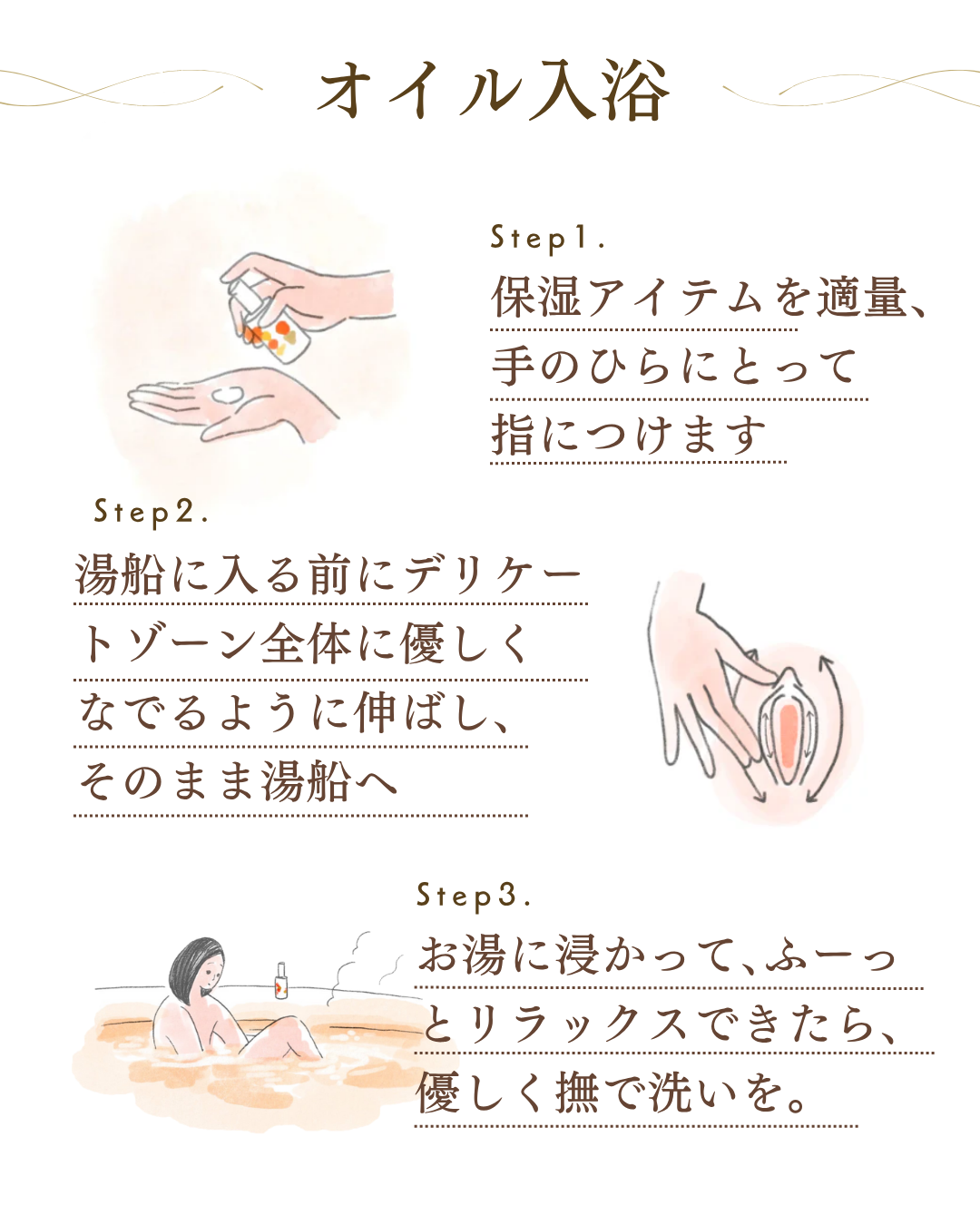 閉経してから、いつもの下着やデニムを履いていると、陰部に痛みを伴うようになり、擦れてるのか?ムレてるのか?色々考えてモヤモヤしている時にこちらの商品に出逢いました。オイルはとっても良くて馴染みもいいから初日から気に入りました。石鹸などで洗わない方がいいと?いつからか?どこかで聞いていて、信じてましたがそんな事はなかった。優しく労わりながら洗ってあげる事がとても優しい気持ちにさせてくれる、、そんないい商品に出会えて本当に良かったです。