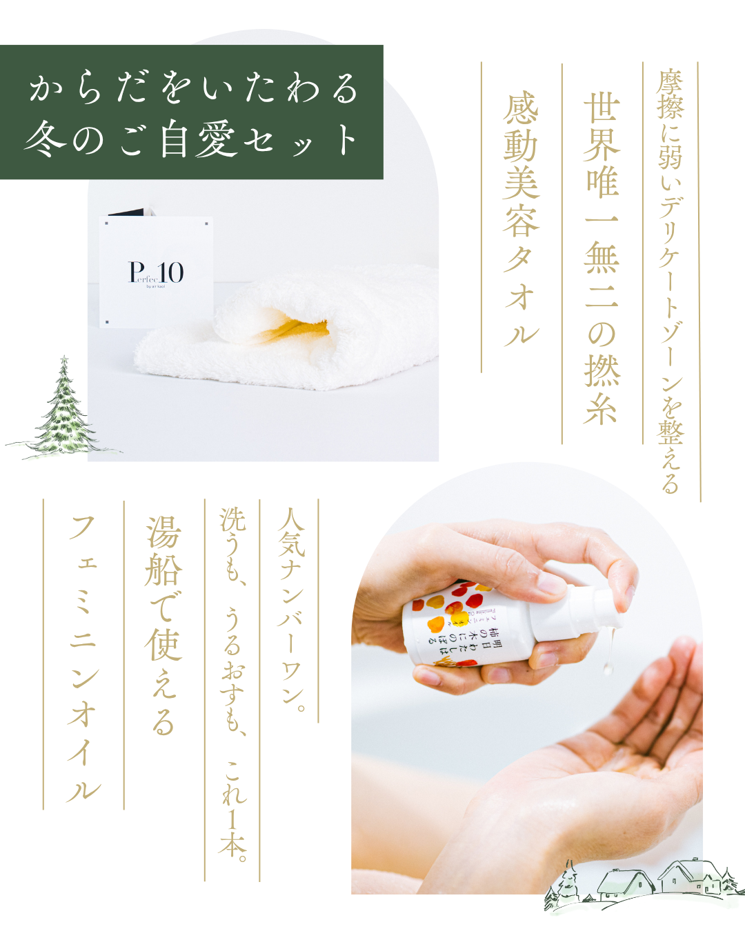 “肌がよろこぶオーガニックコットンの美容タオル” と、湯船に浸かりながら洗浄と保湿が同時にできる人気No.1の“フェミニンオイル”。
