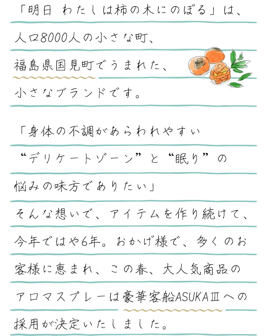 働くこと、休むこと、遊ぶこと、⾷べること、暮らすこと、⽣きること、どんな時も、うえを向いて意思をもって⾃分らしい選択をしていたい。そんな想いを「わたしは柿の⽊にのぼる」という⾔葉にこめています。また「柿の⽊にのぼる」なんて、ちょっと意味不明ですよね。おてんばでも、たまには⼦どもみたいなことをしてみても、「それも個性のひとつだから、どんな⾃分も愛してね」という、私たちからのメッセージでもあります。そして、もしも頑張りすぎて⼼や⾝体を崩しそうになったら、ちょっとだけ⼀呼吸して、思い出してくれたら嬉しいです。今⽇じゃなくて「明⽇」でも大丈夫。