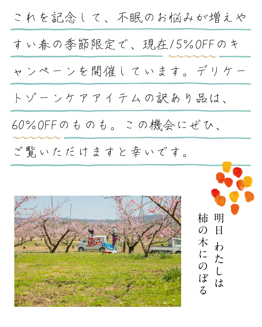 眠れない日もあるぐらい、悩みの尽きない毎日の中で、その温かさに触れて、心がフッと軽くなるのを感じたから。このやさしさを、もっと広げたい。そんな思いで、「明⽇ わたしは柿の⽊にのぼる」は始まりました。