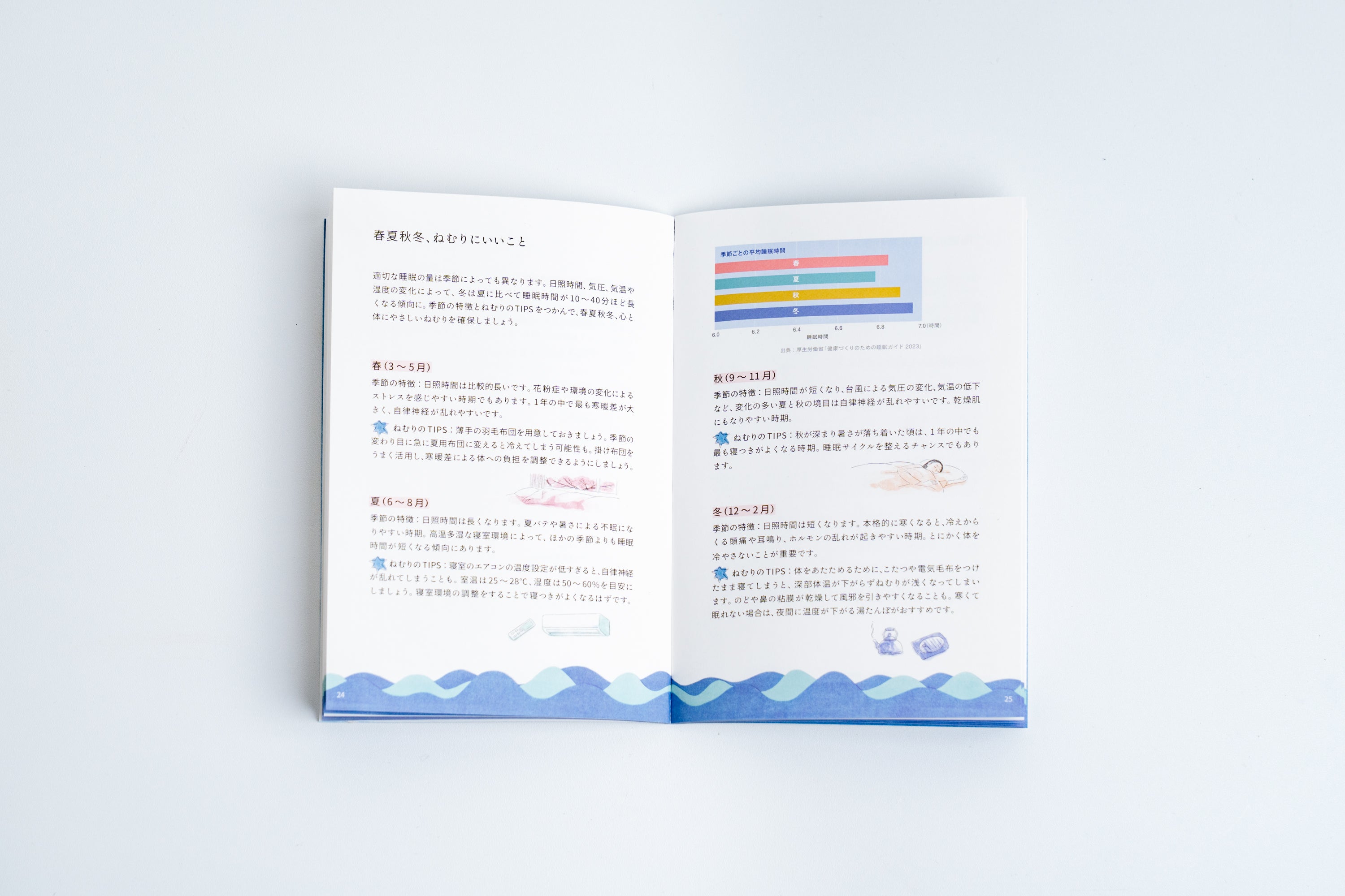 この冊子には、生理の時に眠くなる理由、更年期の時の睡眠のことなど……女性のねむりについて情報が盛りだくさん。また、3カ月分のワークが冊子の中に含まれており、それに取組むことで自分自身の睡眠や体・心の変化に気づくことができます。